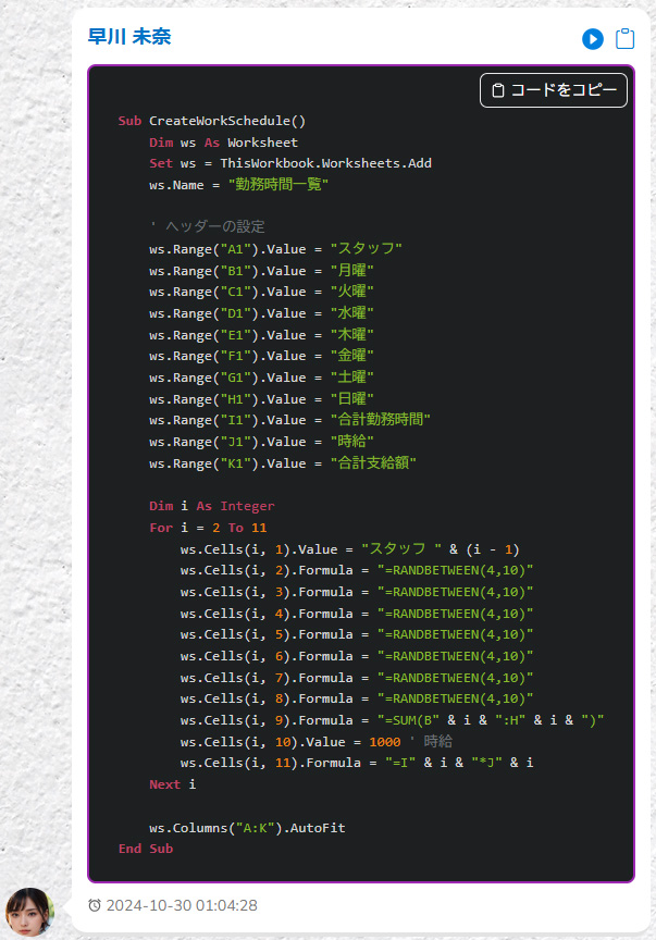 スタッフ10人の、1週間(月曜から日曜まで)の勤務時間一覧を作成してください。マクロ計算式込みで、勤務時間、時給、それぞれの合計も付けてください。VBAで出力してください。